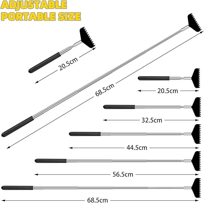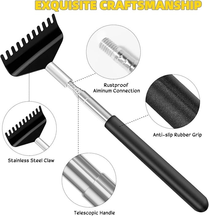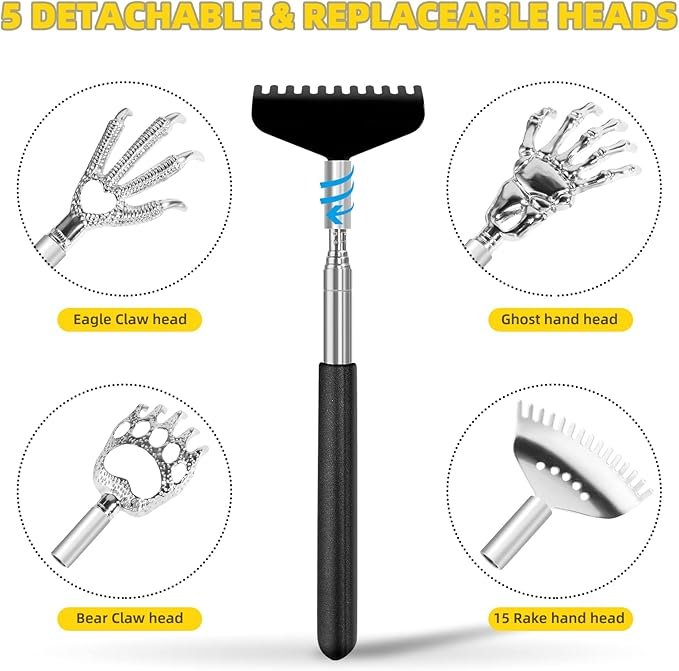• High-quality Material: This portable extendable back scratcher is made of stainless steel. It will never rust for a long time, and it is not easy to bend or deform. Bear Claw and Ghost Hand have 5 teeth,Eagle Claw has 4 teeth. Flat Rake has 11 teeth and Rake Hand has 15 teeth which is great for scratching a large surface area. Soft rubber at the handle bottom allows you to get a good and comfortable grip